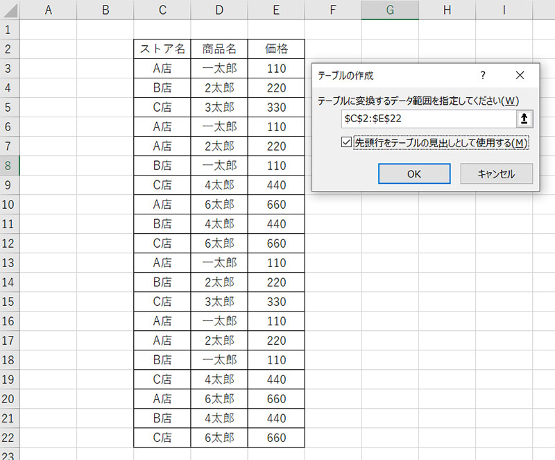 メニューの挿入タブを選択し、テーブル作成を選んで範囲をします。