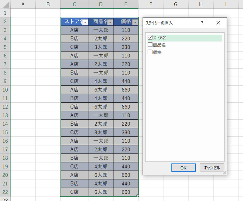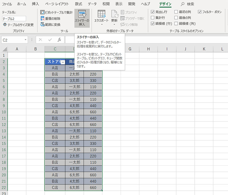 EXCEL機能スライサー挿入の仕方