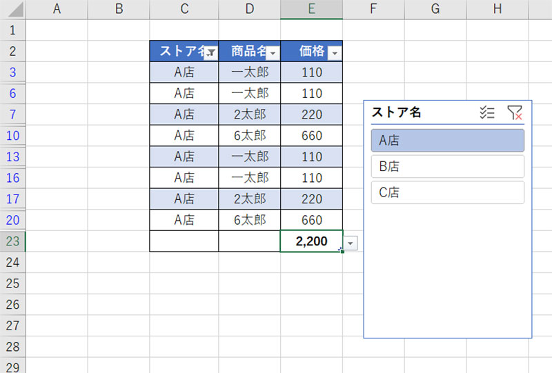 エクセルデータ一覧より、ストア名ごとに売上抽出する場合