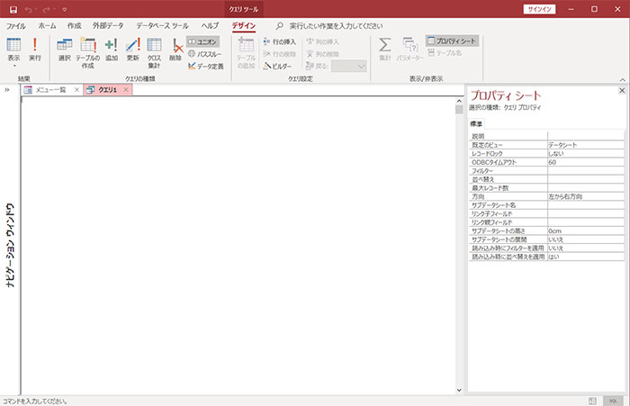 [作成] タブの [クエリ] グループで [クエリ デザイン]-[ユニオン]をクリックします。