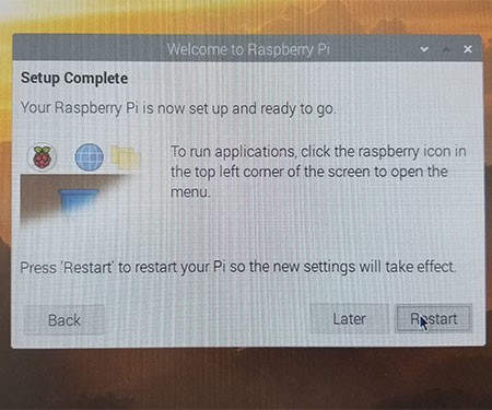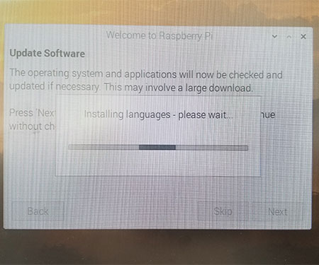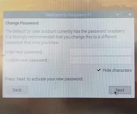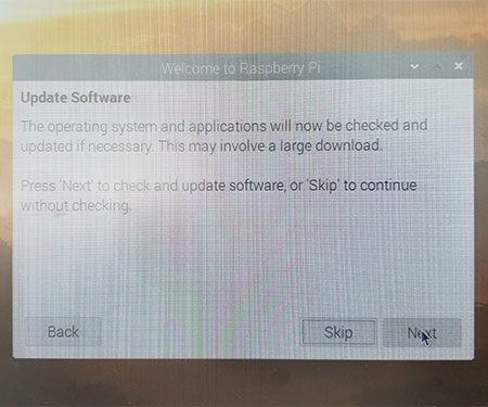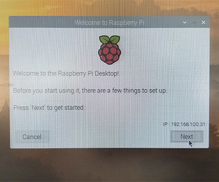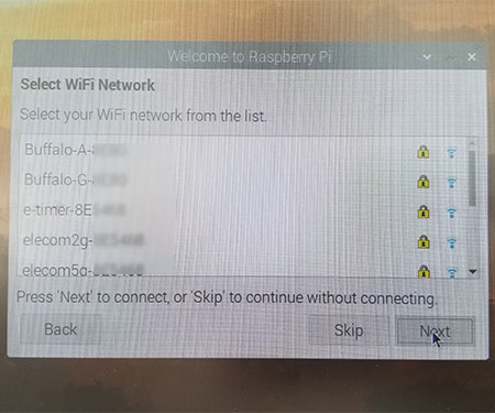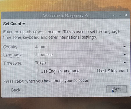 「Welcome to Raspberry Pi」のウィンドウに従って、初期設定を進めていきます。「Next」を選択。